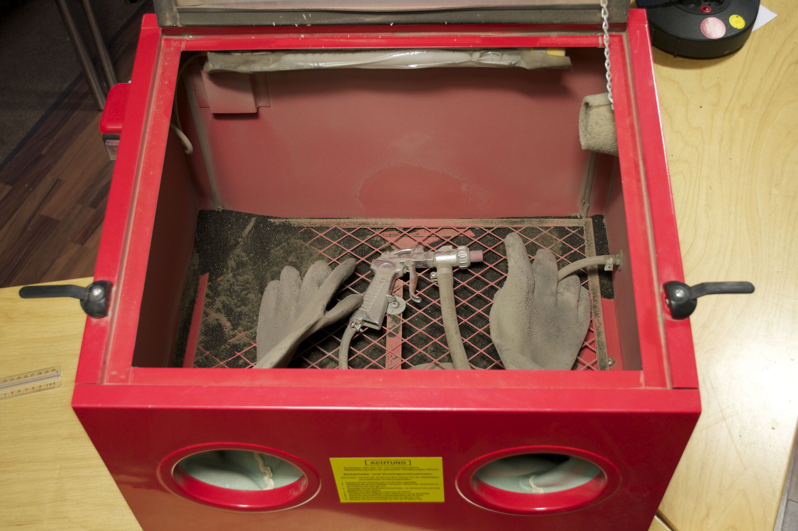 Sandstrahlkabine mit geöffnetem Deckel und Strahlgut. Eigenes Werk.