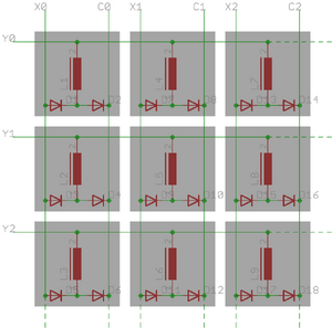 Die Flip Dot Matrix besteht aus jeweils einer Spule pro Pixel, die über einen gemeinsamen Eingang pro Spalte und zwei Eingänge pro Zeile geschaltet werden. Je nach Polung klappt das mit einem Dauermagneten versehene Plättchen zur einen oder anderen Seite. Wenn Xn auf High und Cn auf Low geschaltet werden, gibt es einen Kurzschluss in der Zeile.
